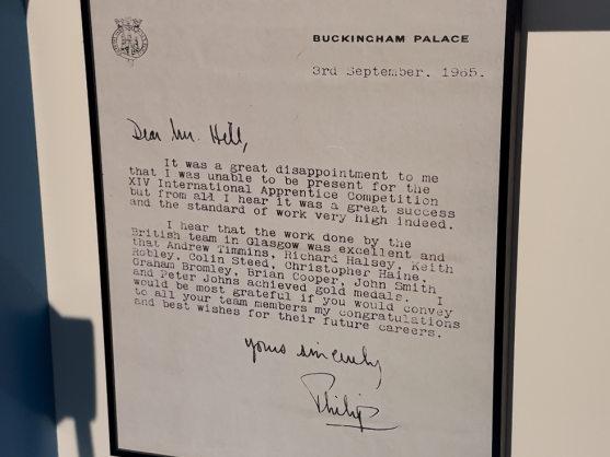 在彼得·琼斯的展品组,展出了1965年格拉斯哥比赛银器制作项目金牌、菲利普亲王向英国队表示祝贺的信件(复制品)和他的一段采访视频。这届听似陌生的比赛,其实正是第14届国际学徒大赛,也可谓世赛的前身。