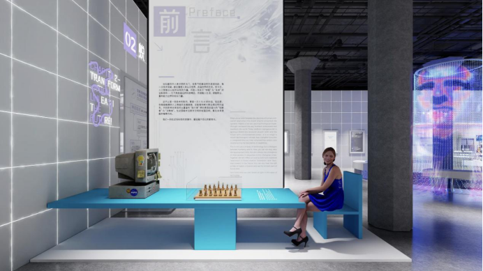 展览开篇处还原了“深蓝”与卡斯帕罗夫对弈——这一人工智能史上里程碑式的经典场景,观众可以坐在棋局之前,拍照开启人工智能的时代序幕。以早期电脑显示器与屏幕构建的艺术装置,展示了第一个聊天机器人ELIZA、第一个人形机器人WABOT-1等最早的人工智能初步成果应用影像。