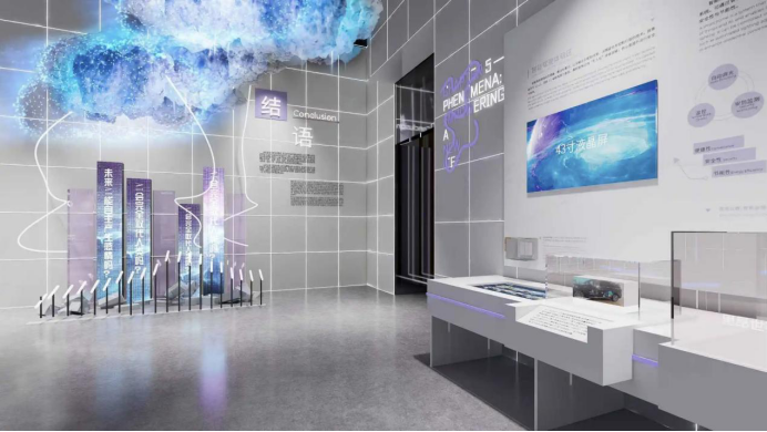 尾厅的“未来回音壁”装置,以云朵构型寄语未来。观众可在观展结束时,扫码发送留言,文字将实时汇入LED屏幕,点亮上方的云朵灯,形成一个“集体创作空间”,也象征集体智慧将共同振动智能未来。